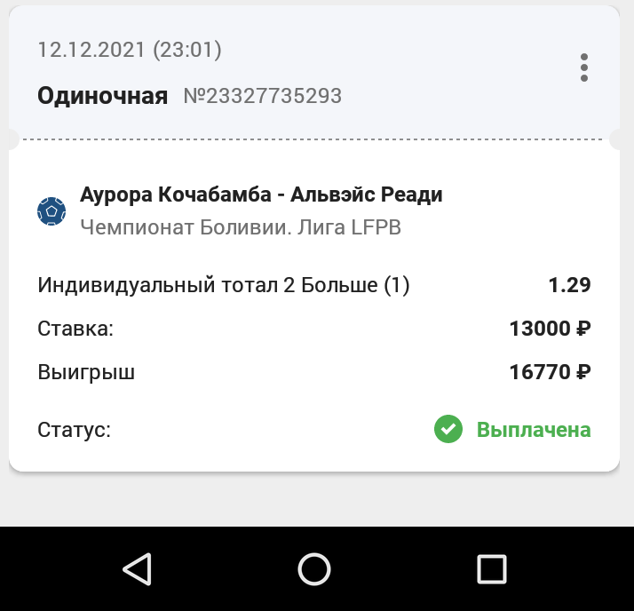 Боливия. Аврора — Олрез реди , Олрейз реди инд тотал больше 1 1.29 , 13 000 р ( перерыв , счет 2-0 )