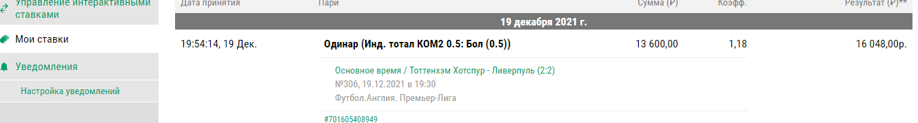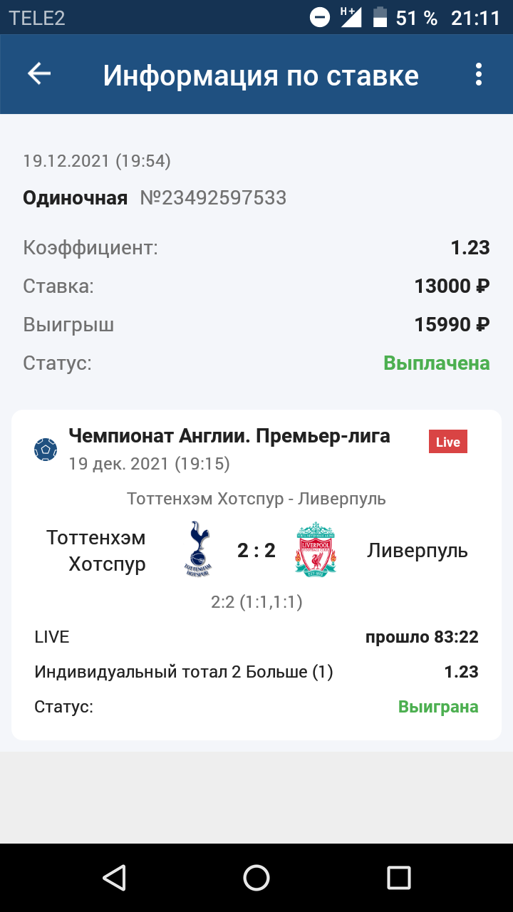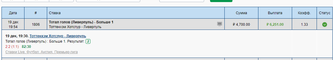 Отчет по трем ставкам на матч Тотенхем — Ливерпуль , счет сейчас 2-2 , уже все давно рассчитали :