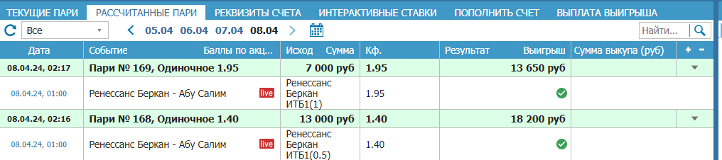 Кубок Каф. Беркан — Абу салим , Беркан инд тотал больше 1 1.95 , 7000 р