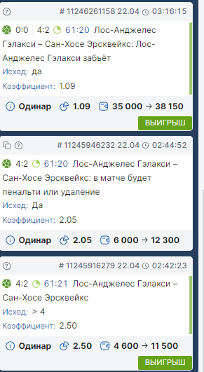 лос анджелес — сан хосе 4-3 , итого + 38 050 р