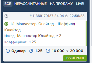 если счет будет 1-1 на 68 минуте добавляем на тотал больше 2.5 за любой кеф 13 000 р