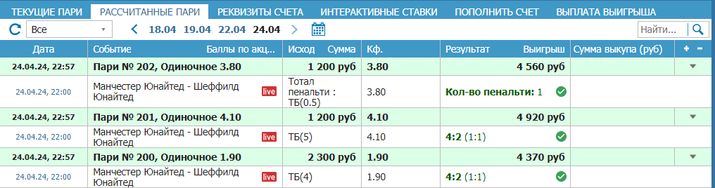 Отчет по матчу Мю — шеффилд , итоговый 4-2 ставка на голы прошла так же прошла ставка на пенальти в матче , в общем абсолютная победа :