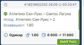 Мексика. Вышка. Сан луис — Сантос лагуна , Сан луис инд тотал больше 1 , 1.68 , 7700 р
