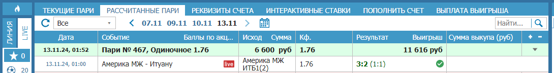 Америка Минейро инд тотал больше 2 , 1.76 , 6600 р