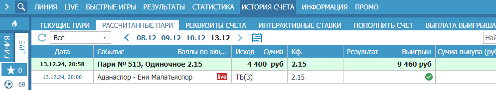 Если Адана не забьет свой гол до 65 минуты добавялем на их мяч за любой кеф сумму 6500 р , если закатят раньше тянем основные ставки.