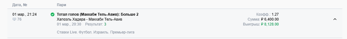 Отчет по матчу Хадера — Макабби ТА , итоговый 2-3 , ставка прошла :