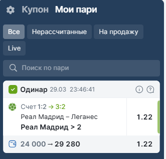 Испания. Вышка. Реал м — леганес , Реал м инд тотал больше 2 , 1.22 , 24 000 р