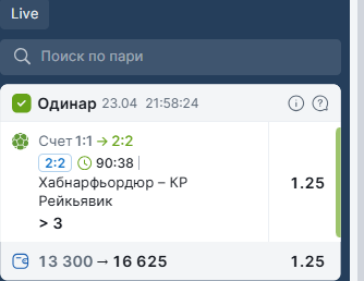 Отчет по матчу Хабнафнордюр — КР рейкьявик, счет 2-2 по ходу 2 тайма , ставка прошла :