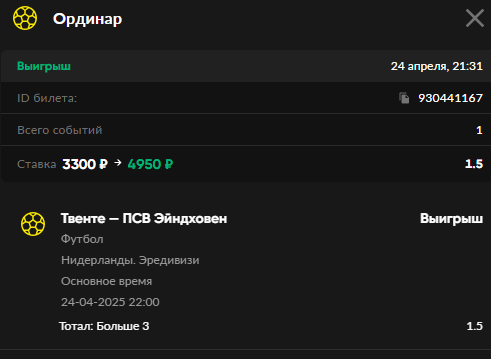 тотал матча больше 3.5 , 1.95 , 2300 р