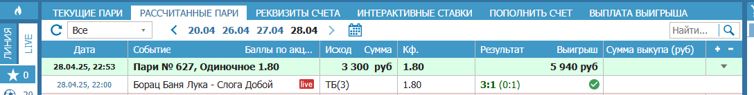 Кристалл — хуан пабло 2 , 3-2 , первый гол от Кристалл на 23 мин, ставка прошла , Борац — слога 3-1 , ставка также на тотал больше 3 прошла :
