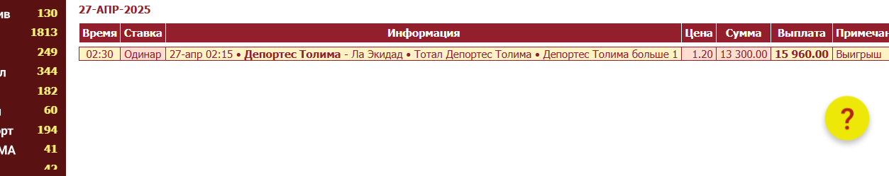 Отчет по матчу Толима — экидад , 2-1 , первый гол от Толимы на 20 минуте , ставка прошла :