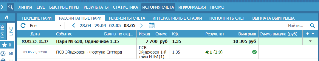 Нидерланды. Вышка. 22:00. ПСВ — Фортуна С , ПСВ инд тотал 1 тайм больше 1 , 1.35 , 7700 р