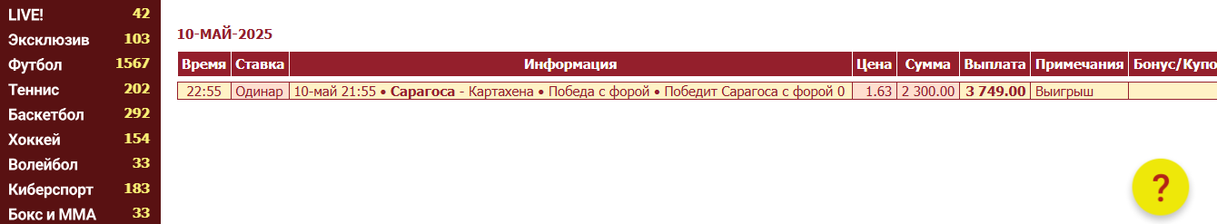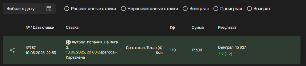 Отчет по матчу Сарагоса — картахена , счет 3-2 , ставка прошла :