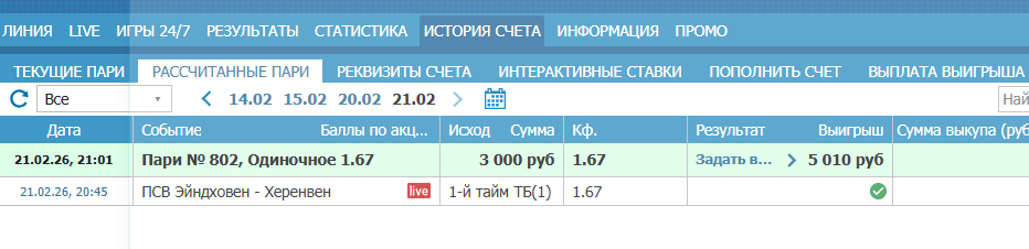 Вышка. Нидерланды. ПСВ — херенвен , тотал 1 тайм больше 1 , 1.67 , 3000 р