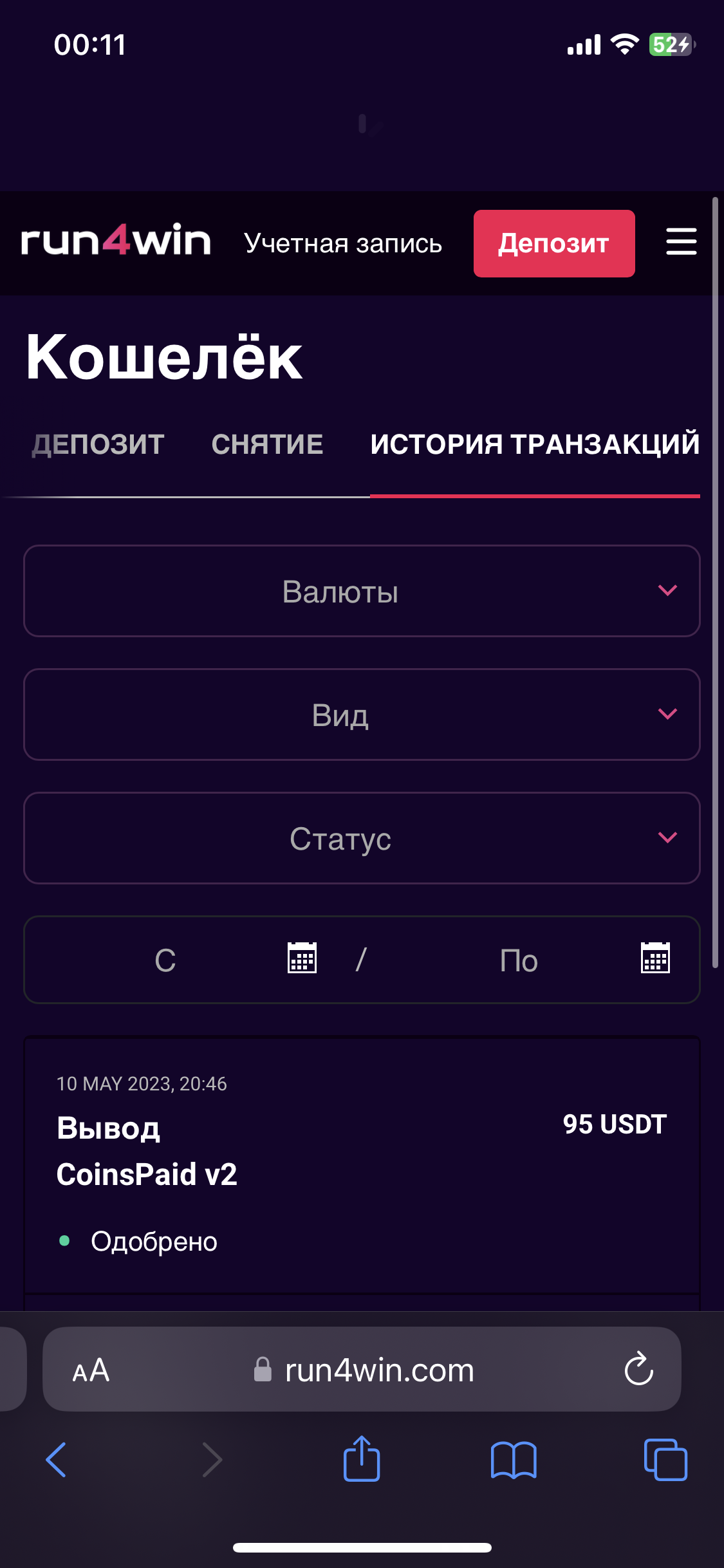 Ребят мне вывели из run4win, я из РФ 95 usdt, просто отыграл отправил доки и поставил на крипту, сначала отменили селфи попросили с листком именно в клетку, чтобы было название казино и дата, после этого через 10 минут на базе были