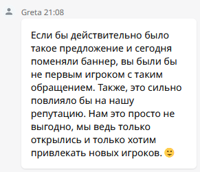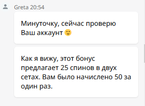Они мне такое в чате вызаложили. Нас уже конкретно за идиотов со склерозом считают. Они говорят что изначально было 50 фриспинов и давали 2 дня по 25, а мне решили разом 50 выдать. Я хоть не играл на свои, но после такого могу смело сказать что конченные люди, которые точно так же могут и кинуть с любой акцией, которая за депозит. Держитесь по дальше от такого дерьма как они!