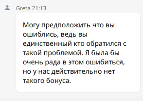 Я специально попросил её узнать у своих. Она сказала что такой вообще не было. Можно просто написать, что я условия акции поменялись и всё. Зачем мне этот бред писать ? Одним пишут что рф под запретом. Мне пишут что я дурачок и такой акции не было и что тебе решили сразу 50 выдать вместо 25.