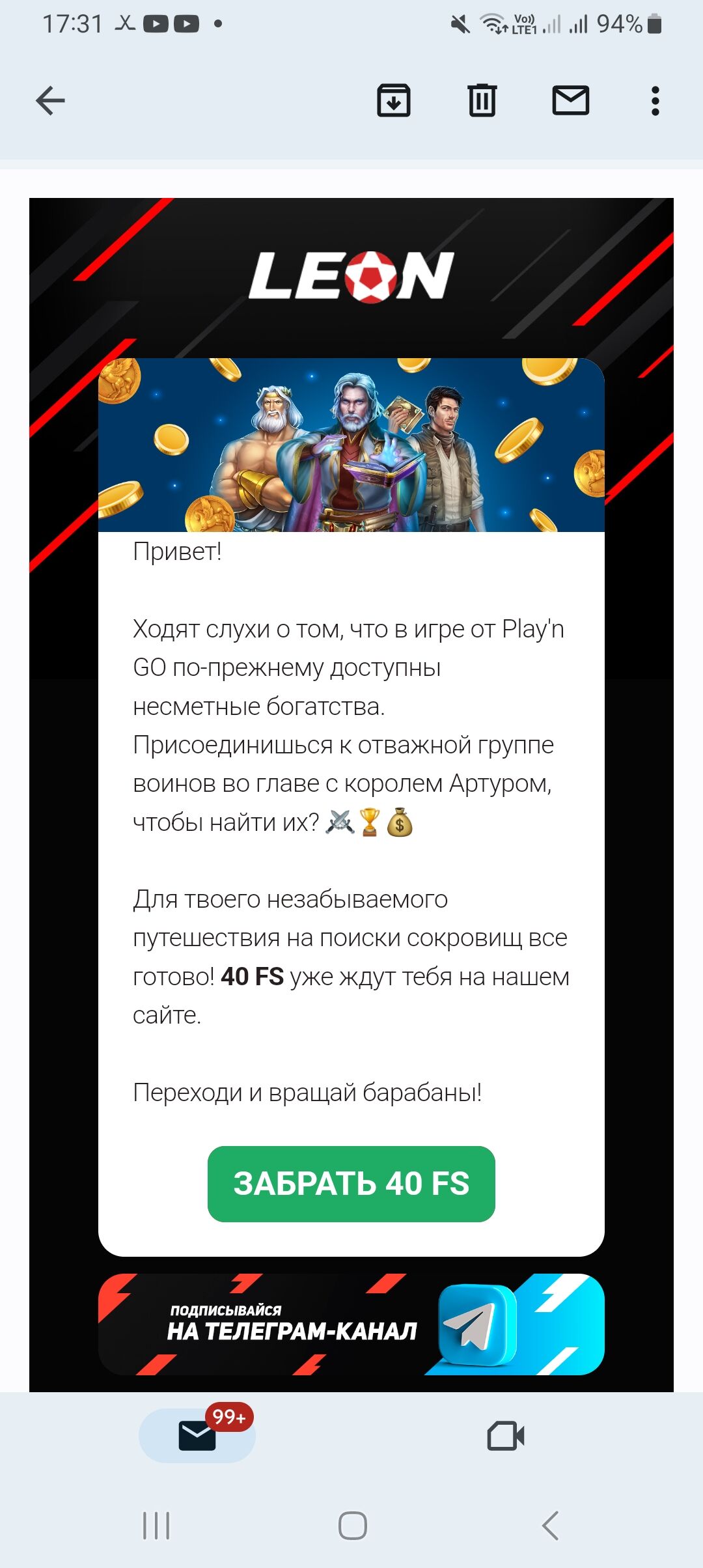 Чекните почту, акки леон бет прислал фриспины отыгрыш х25 с них в том же слоте.