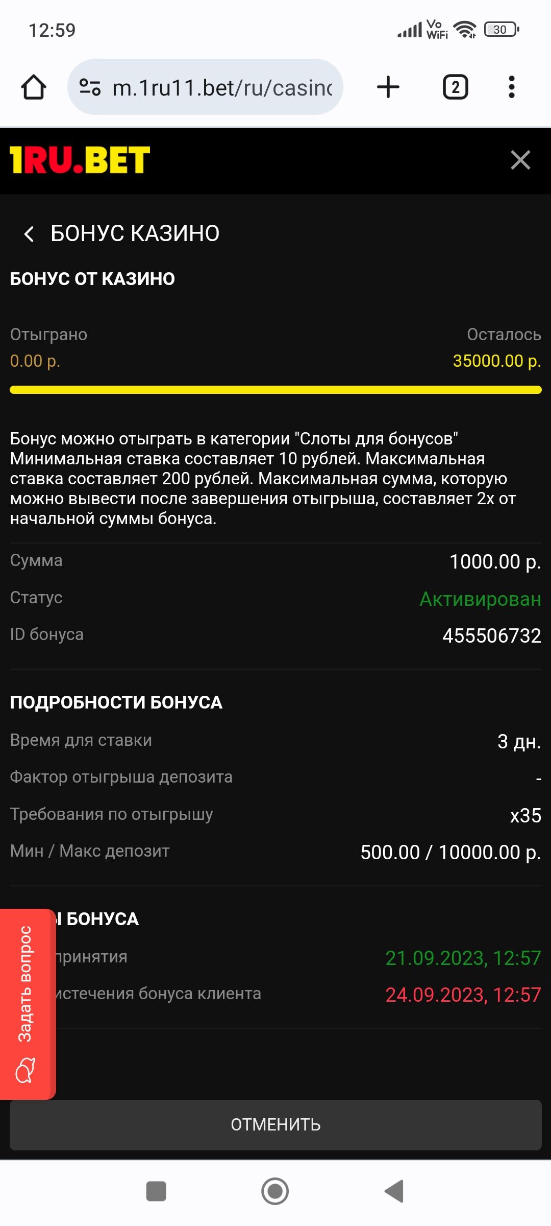Так у меня давно висит этот бонус! Я подробности прочитал и там написано мин.деп 500р.По этому я не стал активировать.Спасибо,что прояснили!