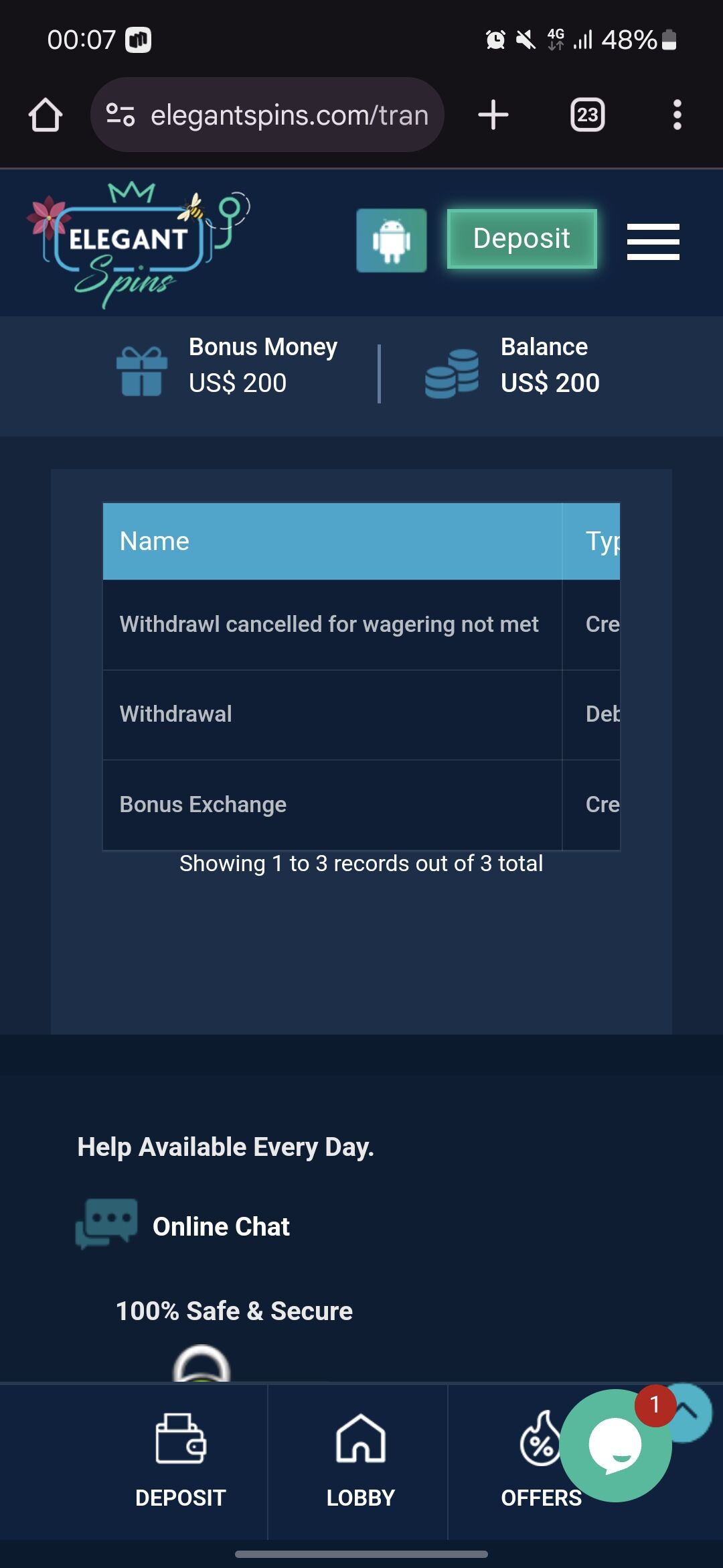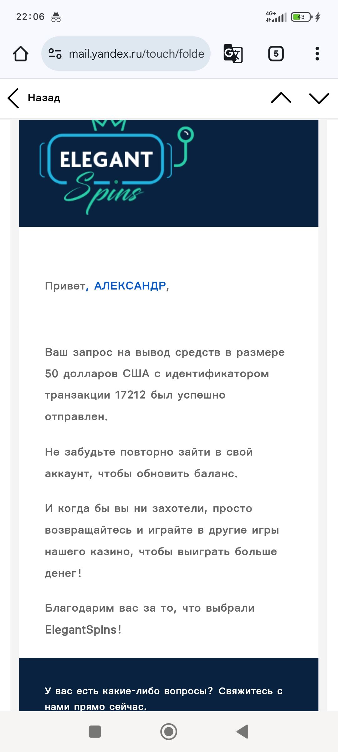 Короче вагер хотел посмотреть какой не нашел думаю может при заявке на вывод покажет сколько отыграть, 50$ ввёл он взял и списал 50$ , а сейчас на почту захожу смотрю сообщения от них