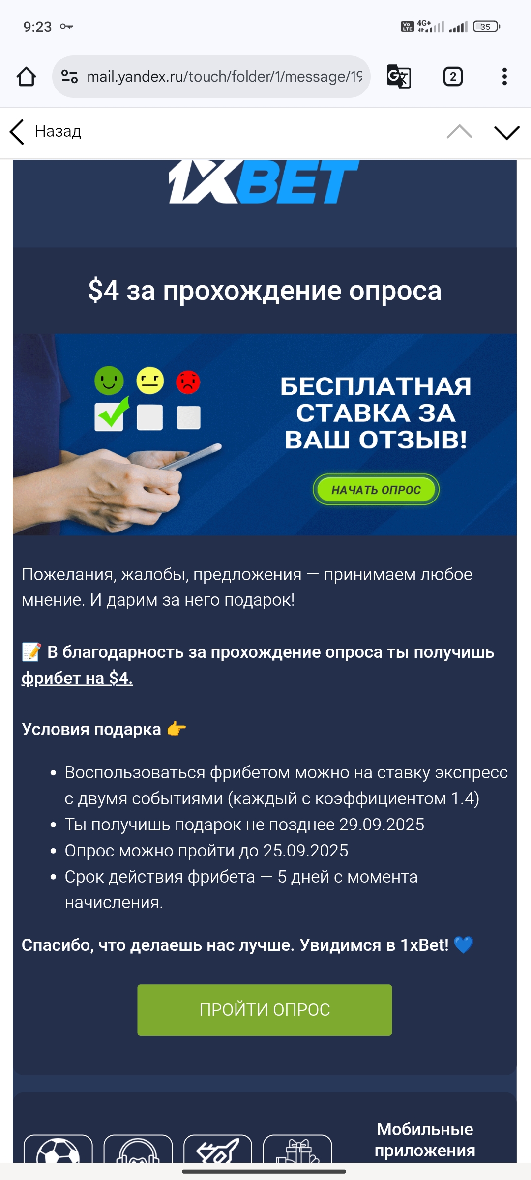 В 1xbe5 за опрос ставку на 4$ обещают