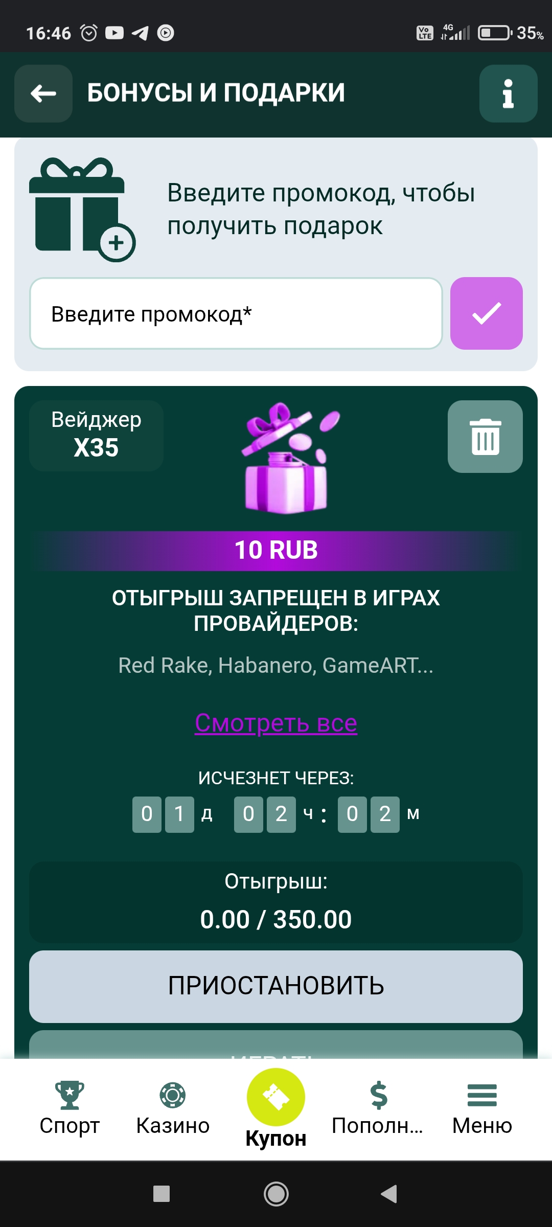 @god я тоже искал,но не нашел ,удалил этот бонус в бонусах и покинул это заведение)