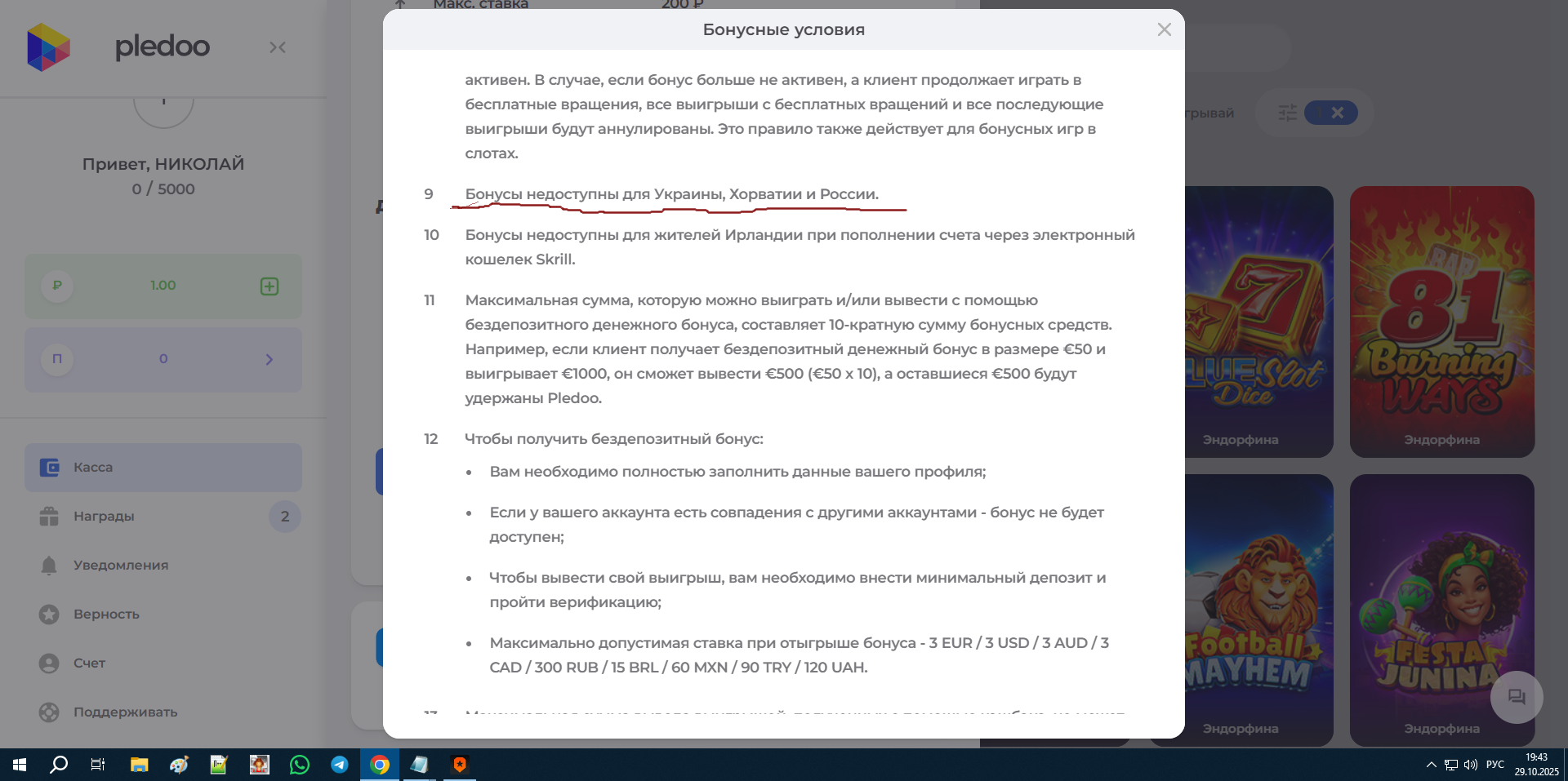 в пледо отыграл 70% на этом все, выше 2.5к баланс не поднимался, бонусок 20 поймал, не одной на х100 одна шляпа… закрыл и забыл…