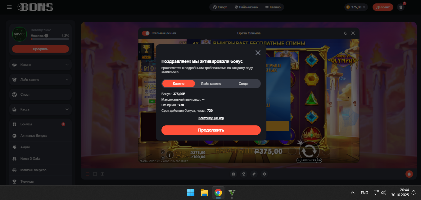 Отыграл вагер в Bons когда на балансе 600 рублей осталось..