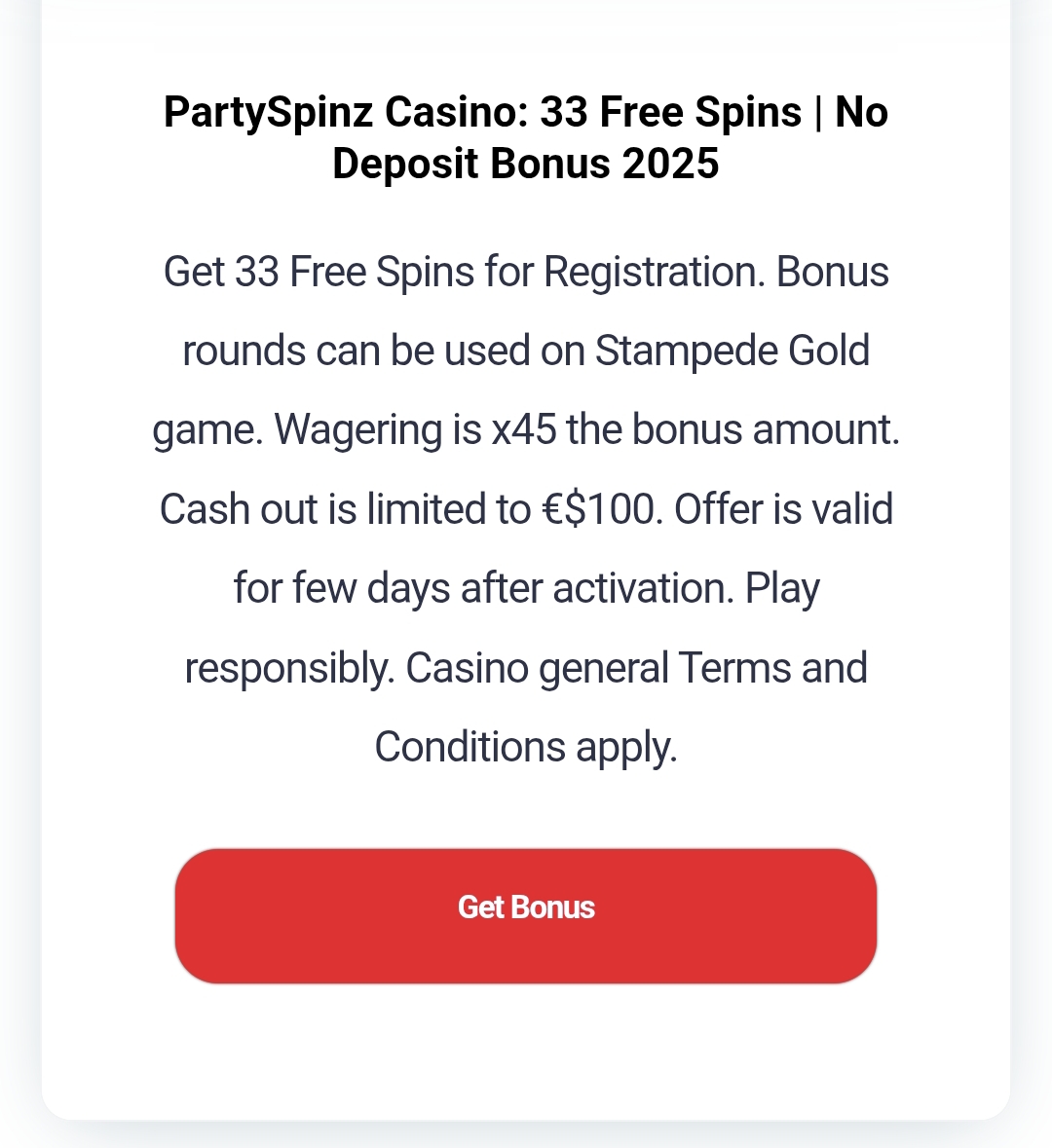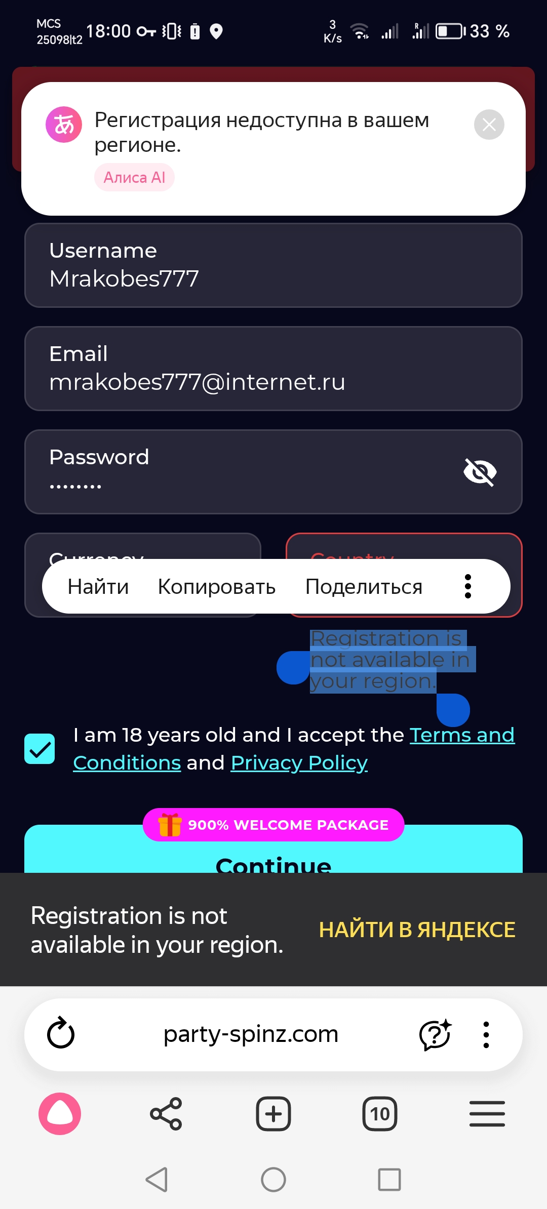 В поддержке PartySpinz сказали, что игрокам из России запрещено играть, хотя в списке запрещённых стран России нет.