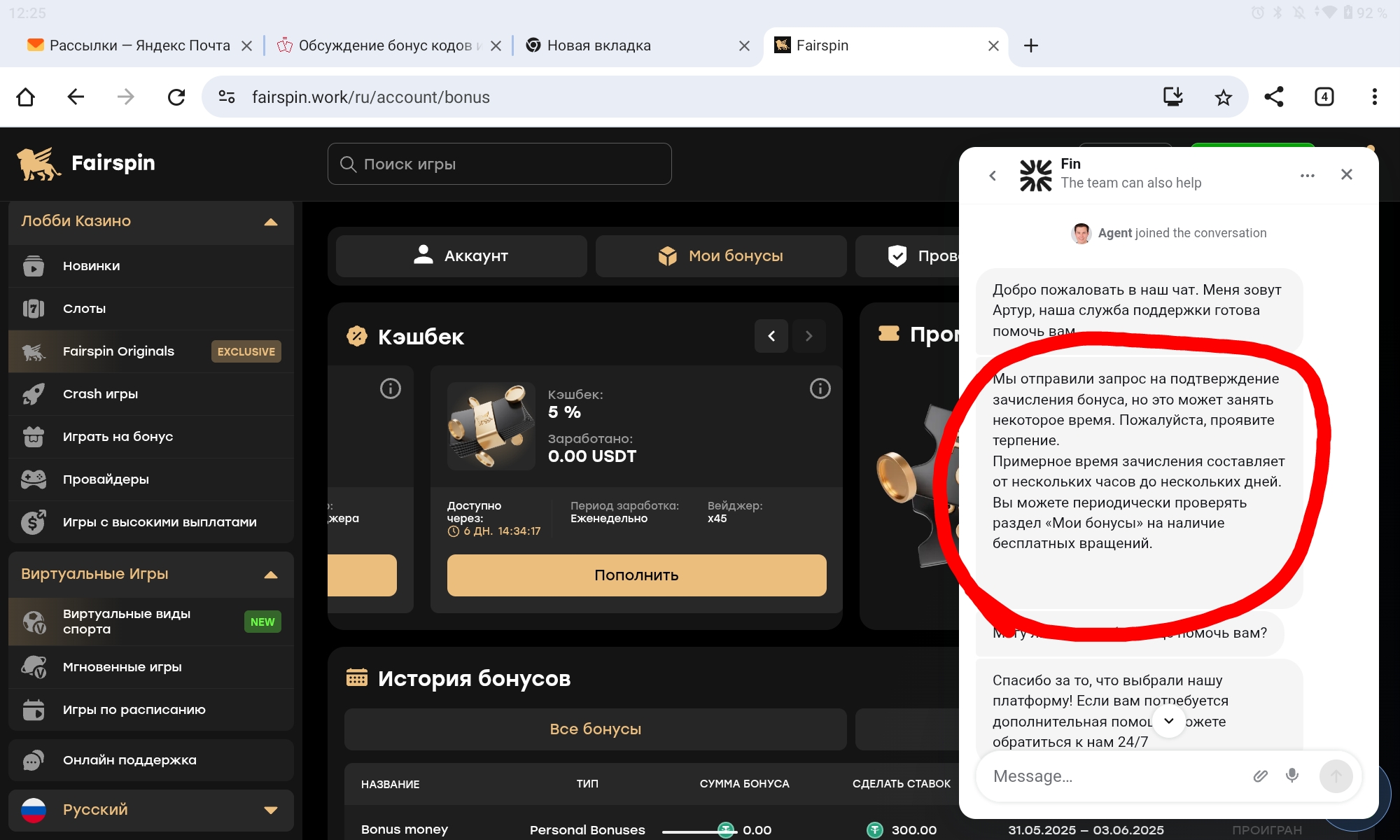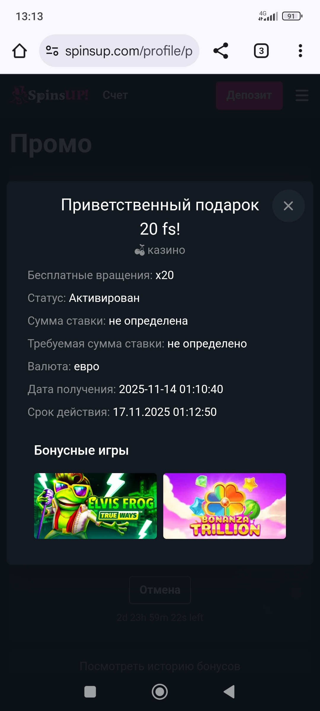 @dzaga10 у меня небыло ,ни на почте ни на сайте. Во вкладке промо на сайте первым этот бонус стоит ,нажал получить ничего не получилось ,и начал в поддержку долбить! Сначало 25$ и 25 фс появились,всё проиграл ,вышел с сайта ,через какое то время захожу ,смотрю висит бонус не отиграный ,понять не могу что за ,вроде обнулил в последнюю сессию,а там ещё висят 250$ и 50 фс.