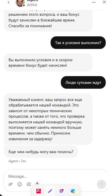 @ident я все равно ничего не понимаю. скажи как их начислить то? просто писав в тп пишут что для вас нету брнуса. на сайте тоже ничего нету