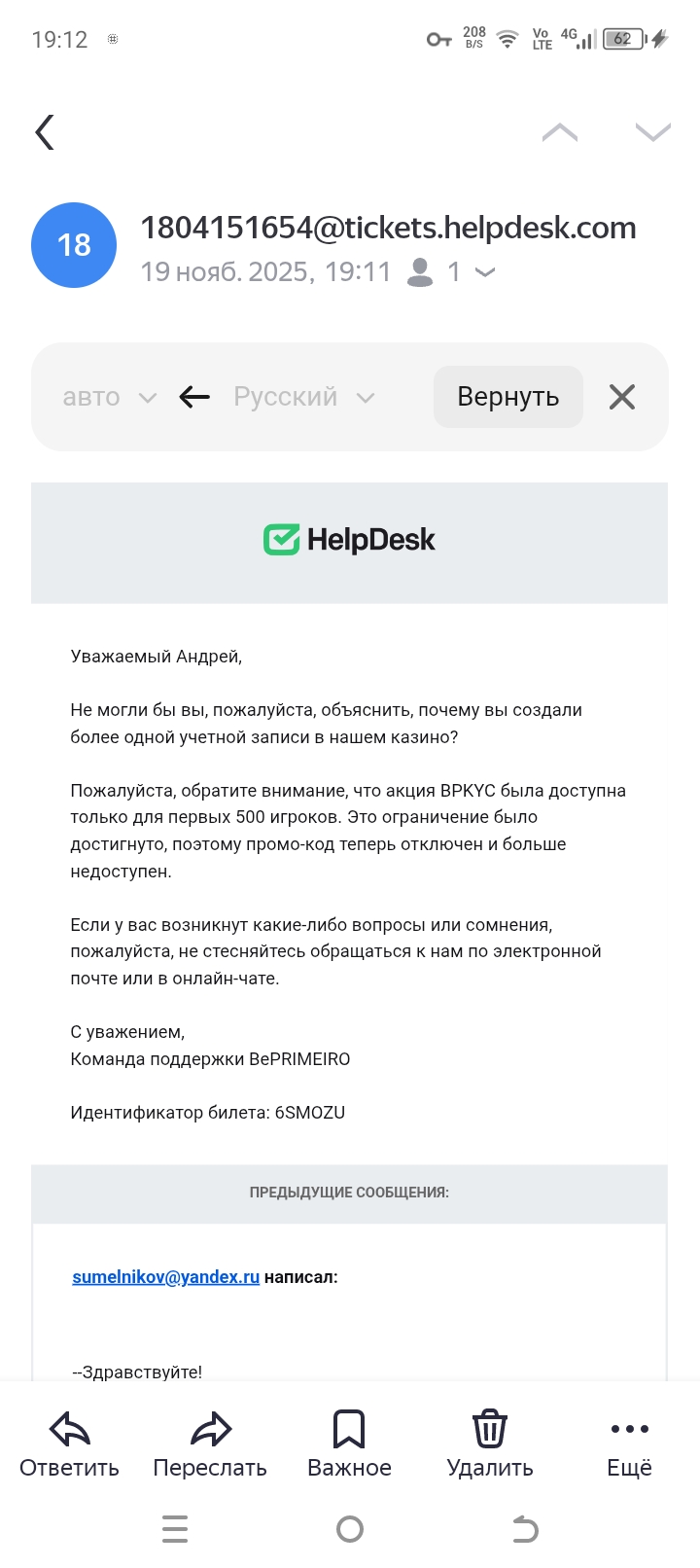 Бетпремейро загрузил доки,и пишу в чат,а там говорят все 500 максимум чел,вы не успели)как мне везет😀
