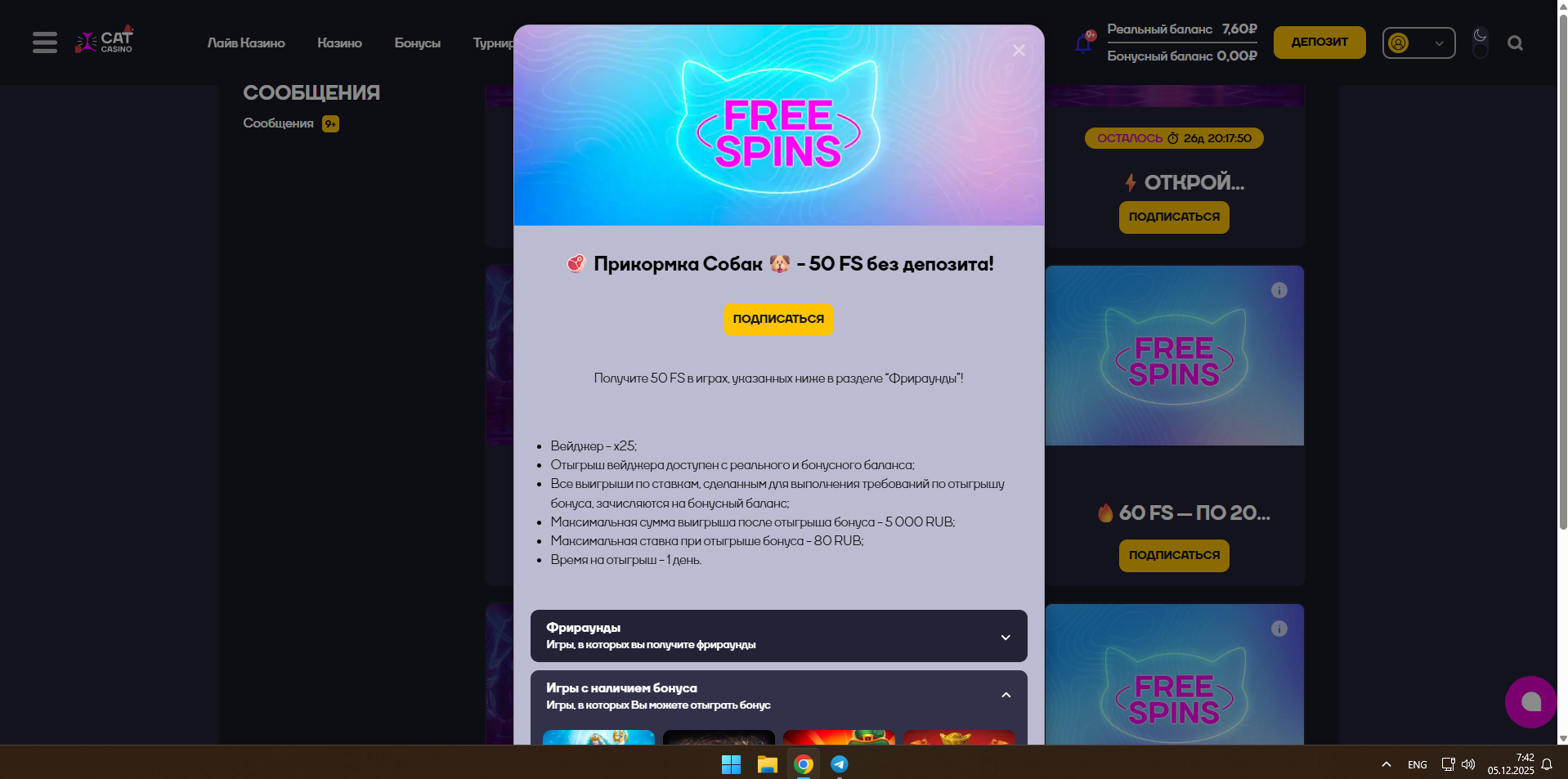 зашел в cat казино,а там 50фс,проверяйте