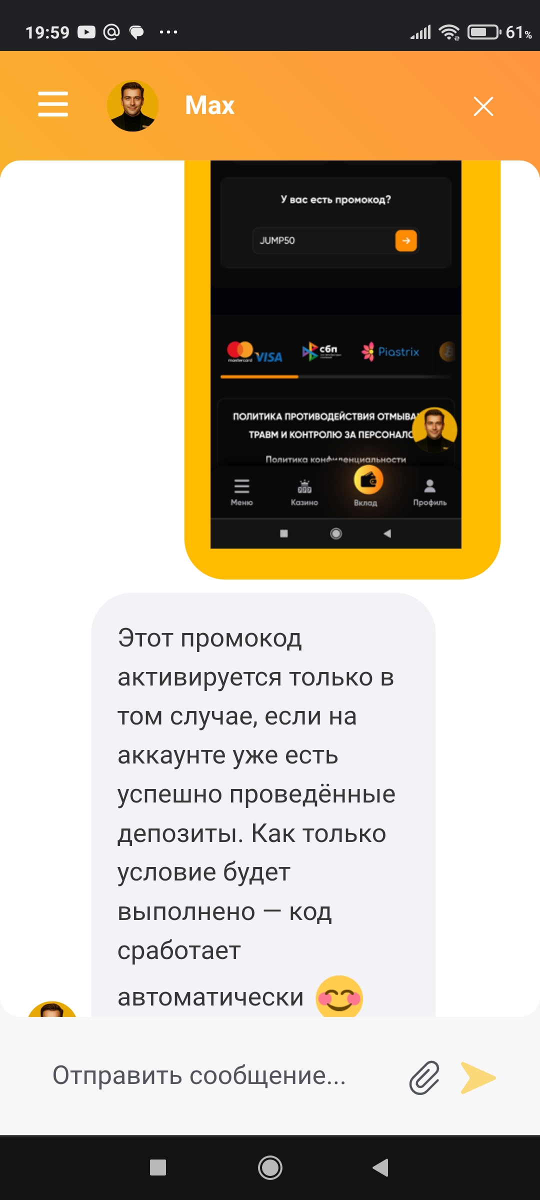 @h00ya Мне тоже присылали 650% на деп, решил 1 000 закинуть ради интереса, закинул — бонус не сработал, написал в поддержку, попросили скрин письма с бонусом и дату, потом через несколько минут в чате присылают бонус код, я его ввёл, мне начислилось 500 рублей бонуса с вагером х30 и 5х макс вин, я им пишу, что это за кидалово, мне пишут: «как я вижу, вы активировали приветственный промокод за депозит, поэтому бонус из письма более не действителен». В итоге просто слил деп и добавил в чс данное казино.