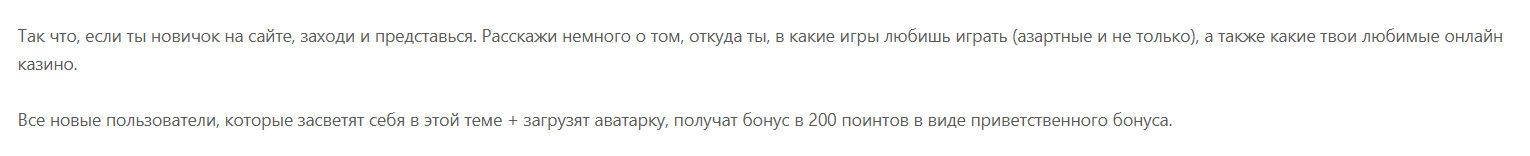 Чтобы получить 200 поинтов вам нужно выполнить : Расскажите немного о себе: представьтесь, откуда Вы, в какие игры любите играть (азартные и не только), а также какие Ваши любимые онлайн-казино?
