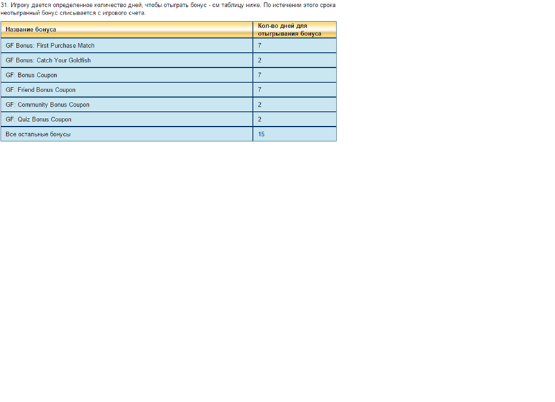 31. Игроку дается определенное количество дней, чтобы отыграть бонус — см таблицу ниже. По истечении этого срока неотыгранный бонус списывается с игрового счета.