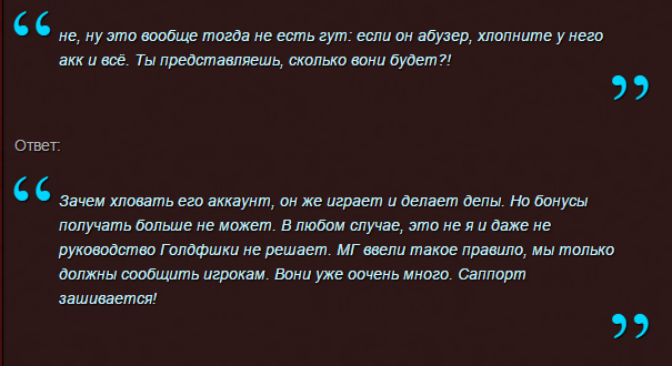 да пока только ГФ то от пользователей и получает!еще ни в одном казино так не возмущались!Хитрый трюк.Сделали бонусы так отмени их перед новыми правилами и все!а нет!они продолжают дурить людей!Люди берут эти р е п к и и автоматически становятся абузерами!просто сбор депов и все!Ох если правда что МГ такие правила ввела то подпортит она себе тыкву относительно других платформ