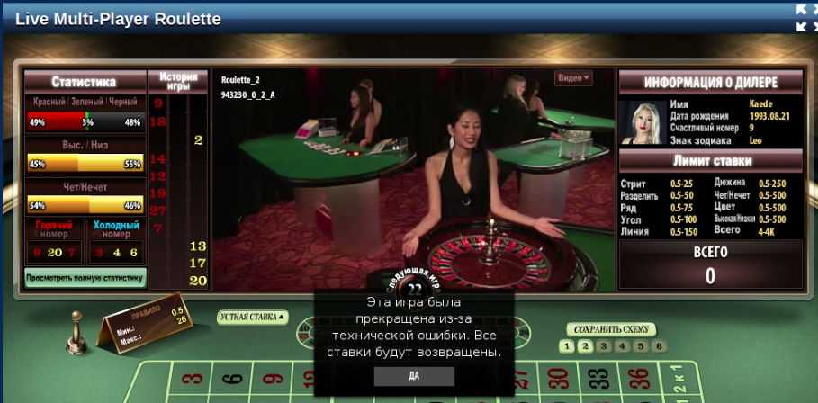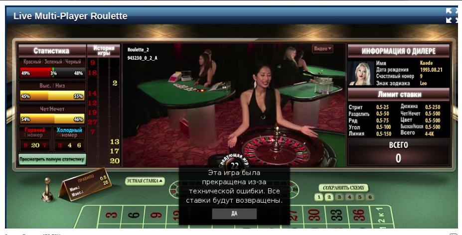 Лично мне вспомнилась ситуация которую видел минимум раза два, а последний это было в ноябре 2015г. Играю на рубли в рулетку с дилерами. Последний номер выпал № 9 красное и естественно увидел его в табло выпавших номеров. Делаю ставки , их принимает казино, дилер вращает колесо и вбрасывает шарик . Через обычный промежуток времени шарик попадает в ячейку № 12 красное (моя ставка сыграл). Я весь в ожидании когда же маркер обозначит выигрышный номер на поле рулетки, жду значит жду … долго жду, около минуты наверно , а ни чего подобного не происходит. Затем дилер рукой начинает тормозить колесо рулетки , останавливает его и … и думаю все выиграл. Но не тут то было… Дилер демонстративно берет руками шарик из ячейки № 12 , переносит в ячейку… какую вы думаете ? Правильно, в ячейку № 9, просто как в шою. Но и это еще не все , ставки со стола исчезают, я просто в «шоке». А через несколько секунд появляется окно с текстом , мол «эта игра была прекращена из-за технической ошибки. Все ставки будут возвращены». Не игра, а сплошной стресс. Скрины постараюсь найти и выложить, но чуть позже.