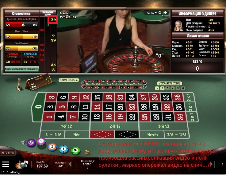 PS.Напомню, что на скрине (пост#113) видно, что в игровом зале, на колесе шарик еще лежит в ячейке «0» зеленый (результат предыдущего раунда), а на табло уже высветился результат следующего спина с выигрышным номером «29» черный.На мой взгляд это «бока» казино! …Чистил кеш, перегружал казино,других окон не открывал, сама трансляция из зала где дилеры была ровная, скорость инета близкая к 30. Сделал все что смог, но ни чего не помогало. По этому написал «туда» и «здесь», пусть люди тоже будут в курсе. 🙂