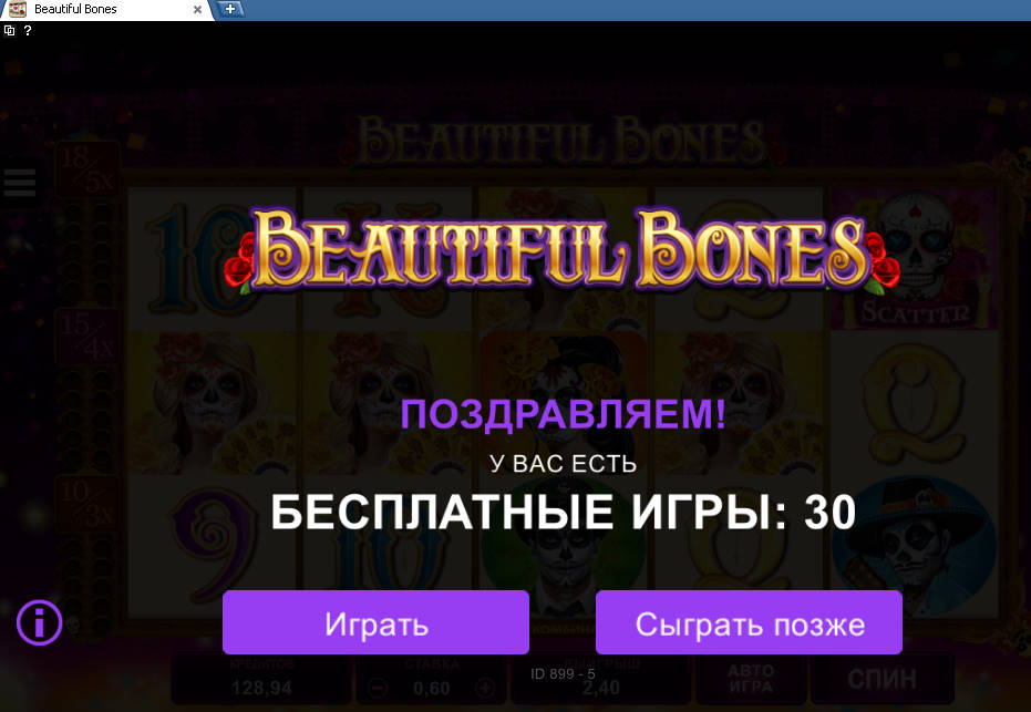 30 спинов по ставке 12 рублей за депозит от 3000 до 4499 рублей в Beautiful Bones