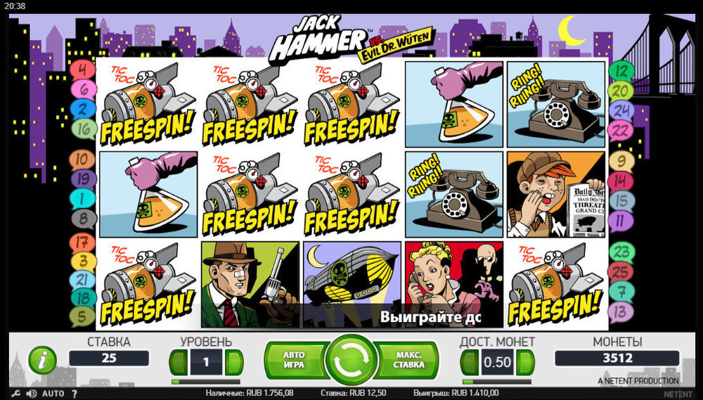 Казино Эверум, слот «»JACK HAMMER», ставка минимальная 12,5рЭ, выпало «СЕМЬ» бонусных скаттеров, выирыш х>110
