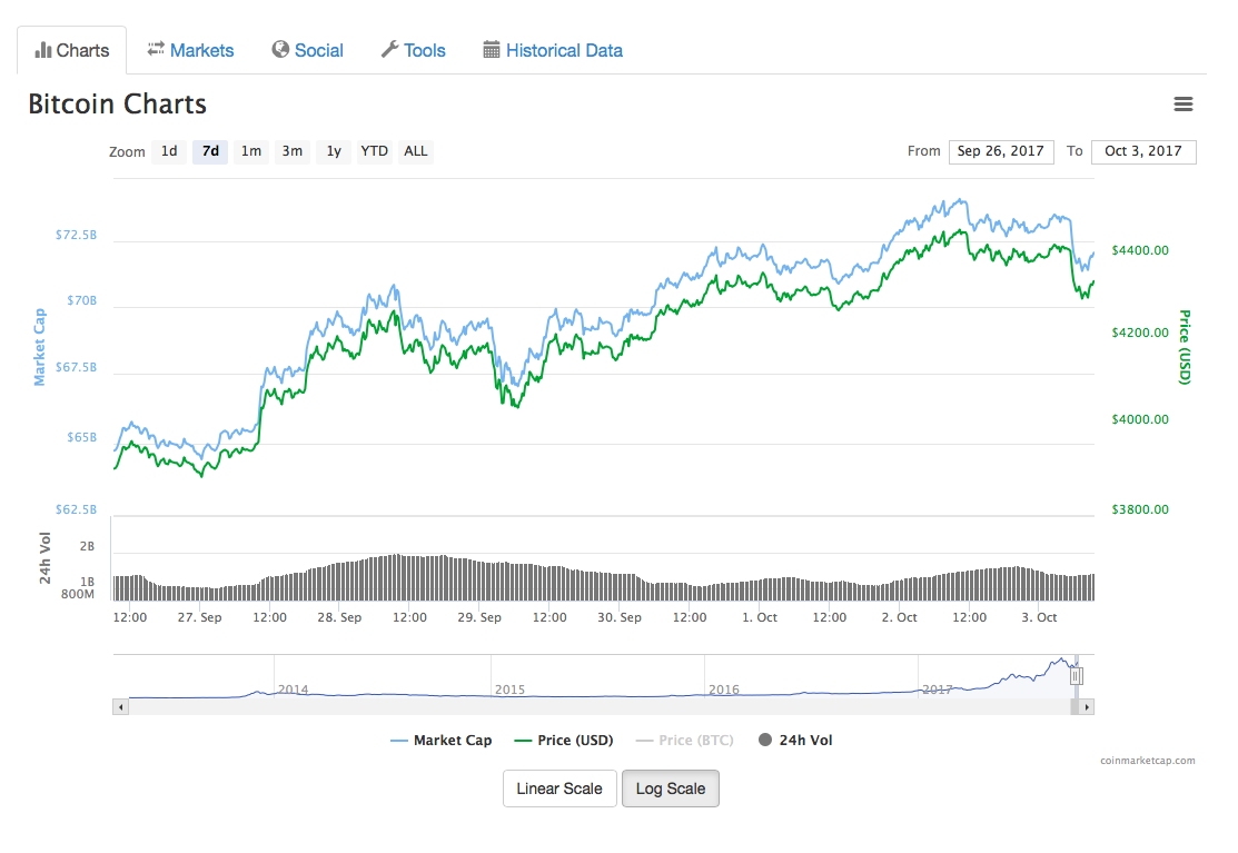 После падения ниже 3 000$ из-за регулирующей кампании Китая против криптовалют, цена Биткоина продолжает расти и двигается к 4 500$. По состоянию на 04.10, Биткоин торгуется на уровне 4 303$, что меньше чем за день до этого на 2,53%.