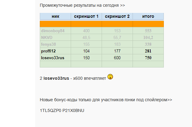 Что касается конкурса, то время еще есть до конца месяца. Напоминаю, что необходимы новые скриншоты/результаты для публикации дополнительных бонус-кодов для участников.