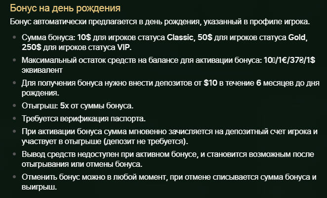 Условия бонусов и требования по отыгрышу публикуются заранее и являются одинаковыми для всех игроков. Участие в акциях всегда добровольное – вы можете принимать предложение только если его формат вам подходит.