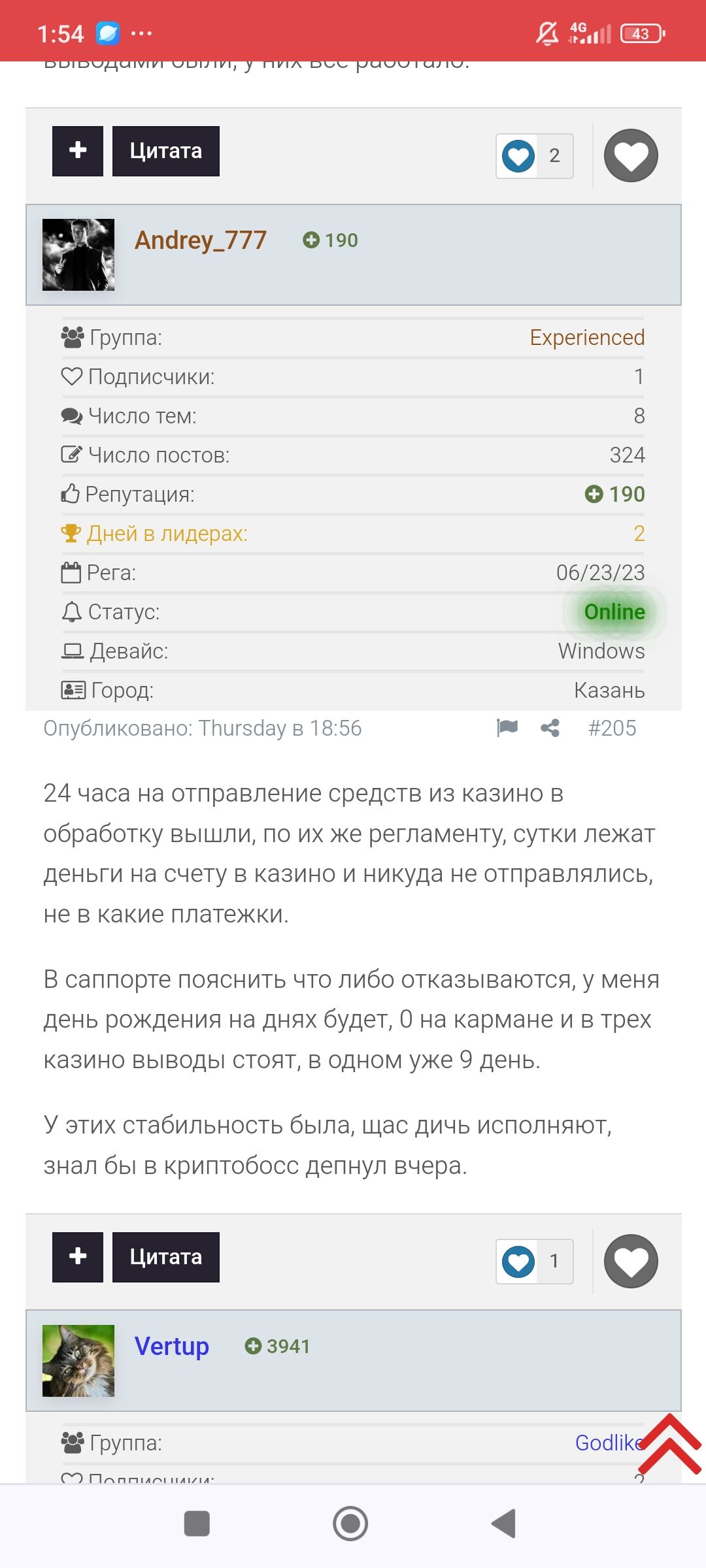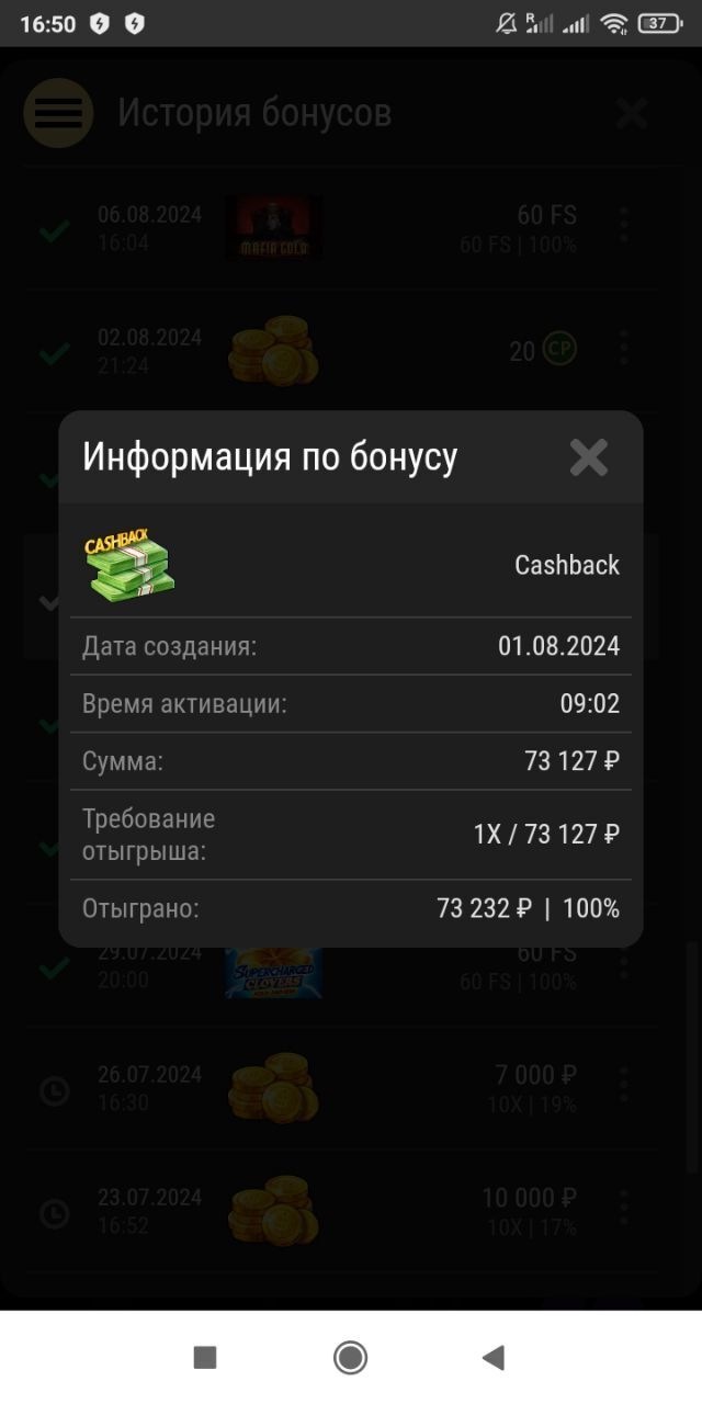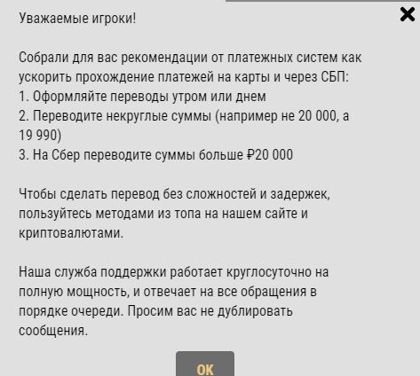 Мой вывод в этом казино был каждый раз дольше, чем прошлый. вначале пара выводов классических по 10 часов, потом пошла череда 2 вывода по 2-5 минут, 2 вывода по 2-5 часов, потом пара выводов по 24 часа и крайний я ждал только когда в обработку уйдет больше суток, то есть деньги из казино. И они ушли и пришли ко мне на карту. Они хоть что-то делают и выводят деньги, пускай по 24 часа, но зато без отмен вывода.