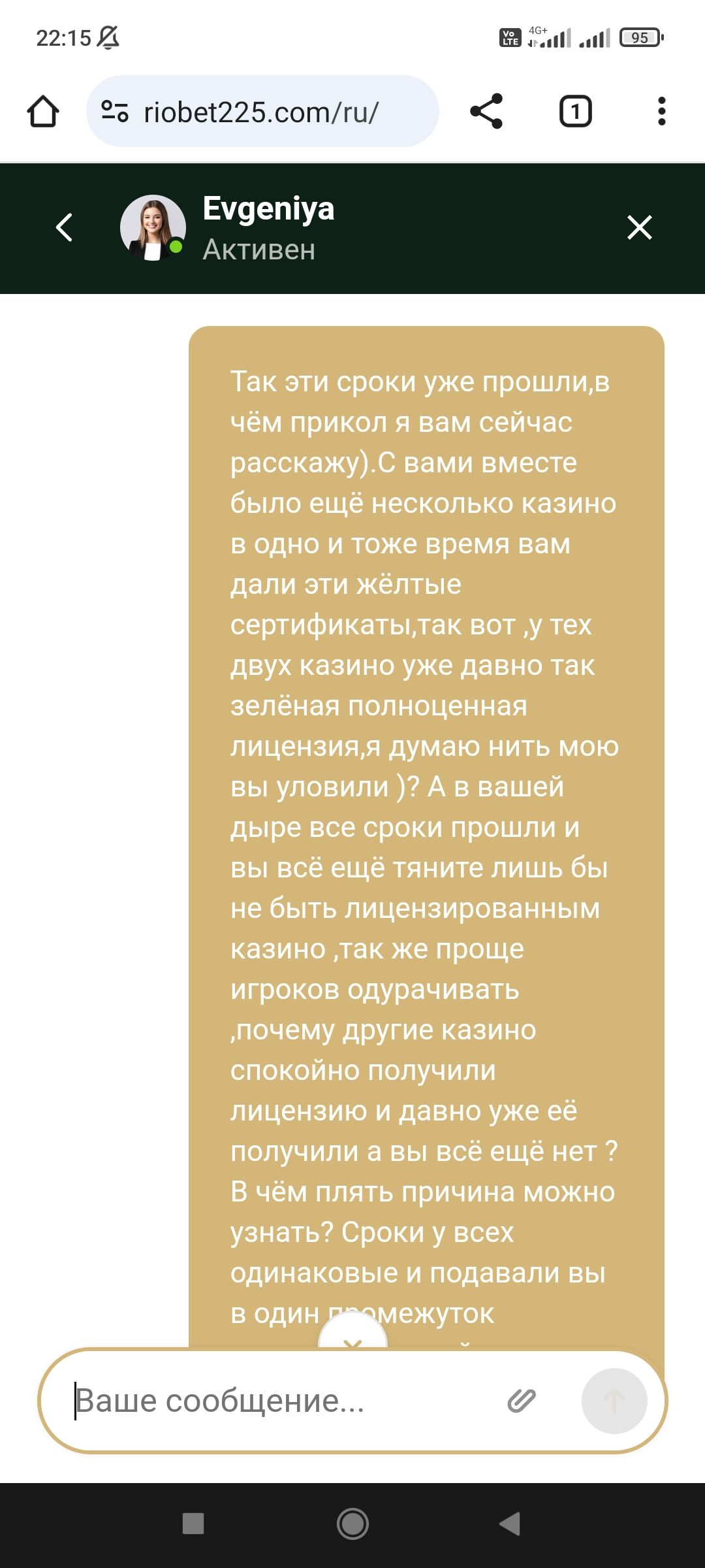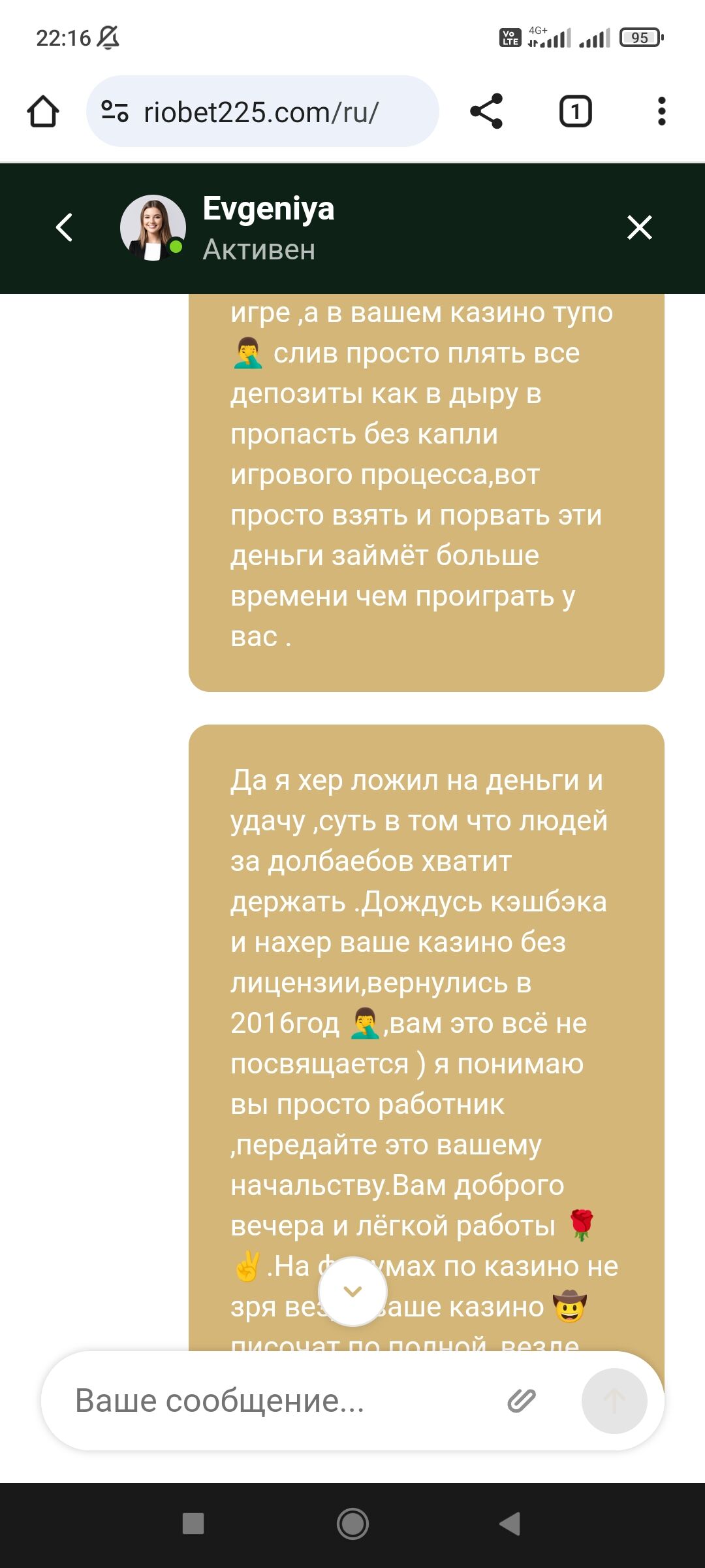 И я Честно и Открыто предупредил Riobet, что просто так этот вопрос не оставлю и размещу эту информацию на ВСЕХ профильных сайтах и форумах. если мой вопрос не решится. И что они потеряют больше…