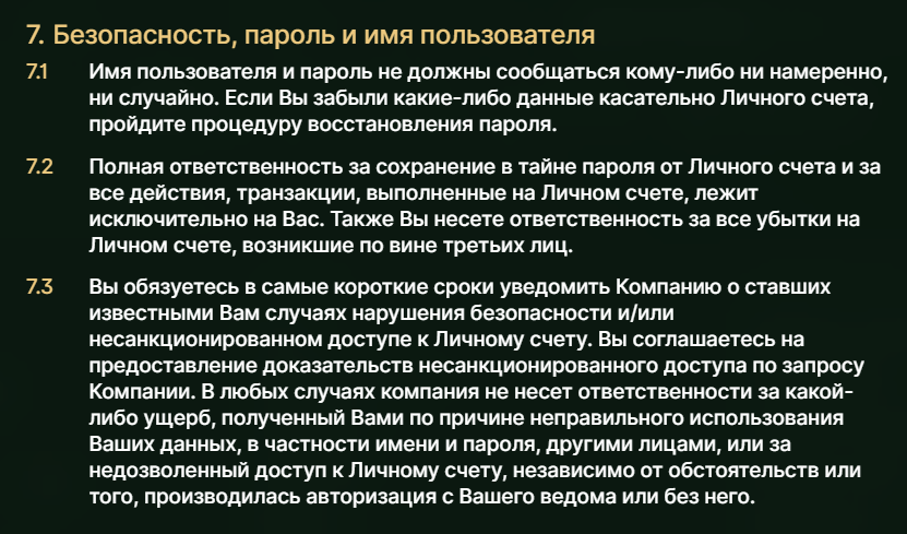 7.3: “Даже после того, как официальный результат События уже известен, букмекерская платформа может признать указанные ставки недействительными, если считает, что Игрок/Игроки действовали в сговоре или как синдикат, или если ставки были сделаны одним или несколькими Игроками в течение короткого периода времени.”.