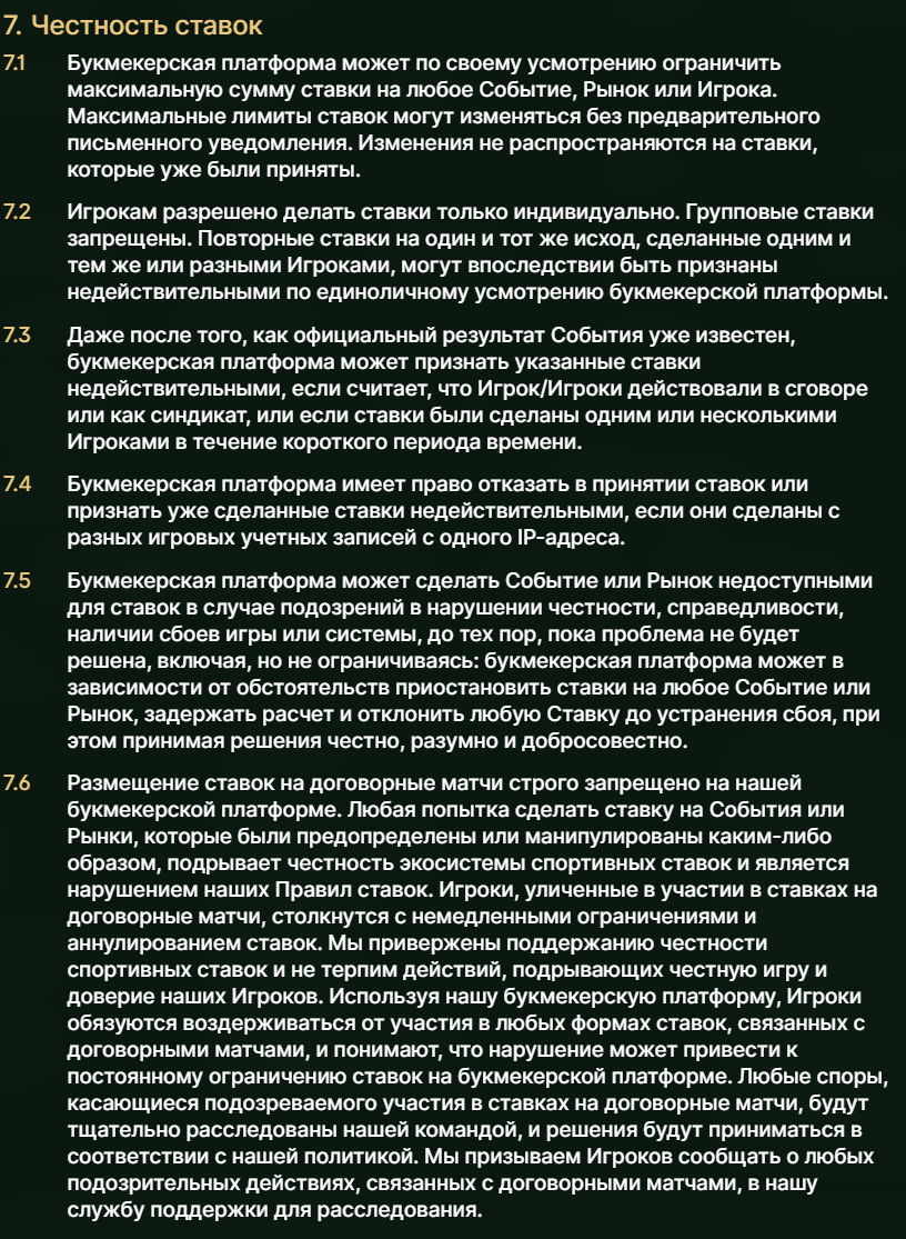 7.2: “Игрокам разрешено делать ставки только индивидуально. Групповые ставки запрещены. Повторные ставки на один и тот же исход, сделанные одним и тем же или разными Игроками, могут впоследствии быть признаны недействительными по единоличному усмотрению букмекерской платформы.