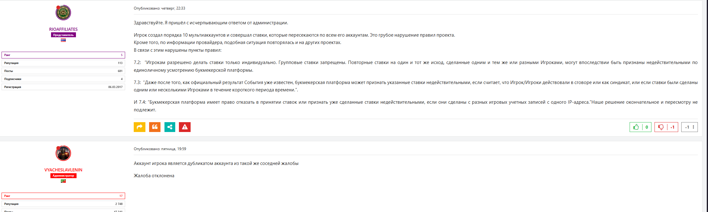 я почитал жалобу на Риобет, Ленин же тоже привел доказательства о пересечении аккаунтов из прошлой жалобы…, от Вас никаких комментов — если Вы нарушили, то собственно проблема у Вас. Я, к примеру, за годы игры ни в одном казино не делал дубликаты — один раз случайно сделал в казино х, но они мне сами позвонили и договорились заблокировать один из акков. По итогу, Вы же сами когда создаете мультики, Вы же знаете на что идете… поэтому будет уроком. Если Ленин и представитель Риобет неправы — Вы можете открыть данную жалобу заново, но предоставив от себя доказательства, что мультов не было и это ошибка…