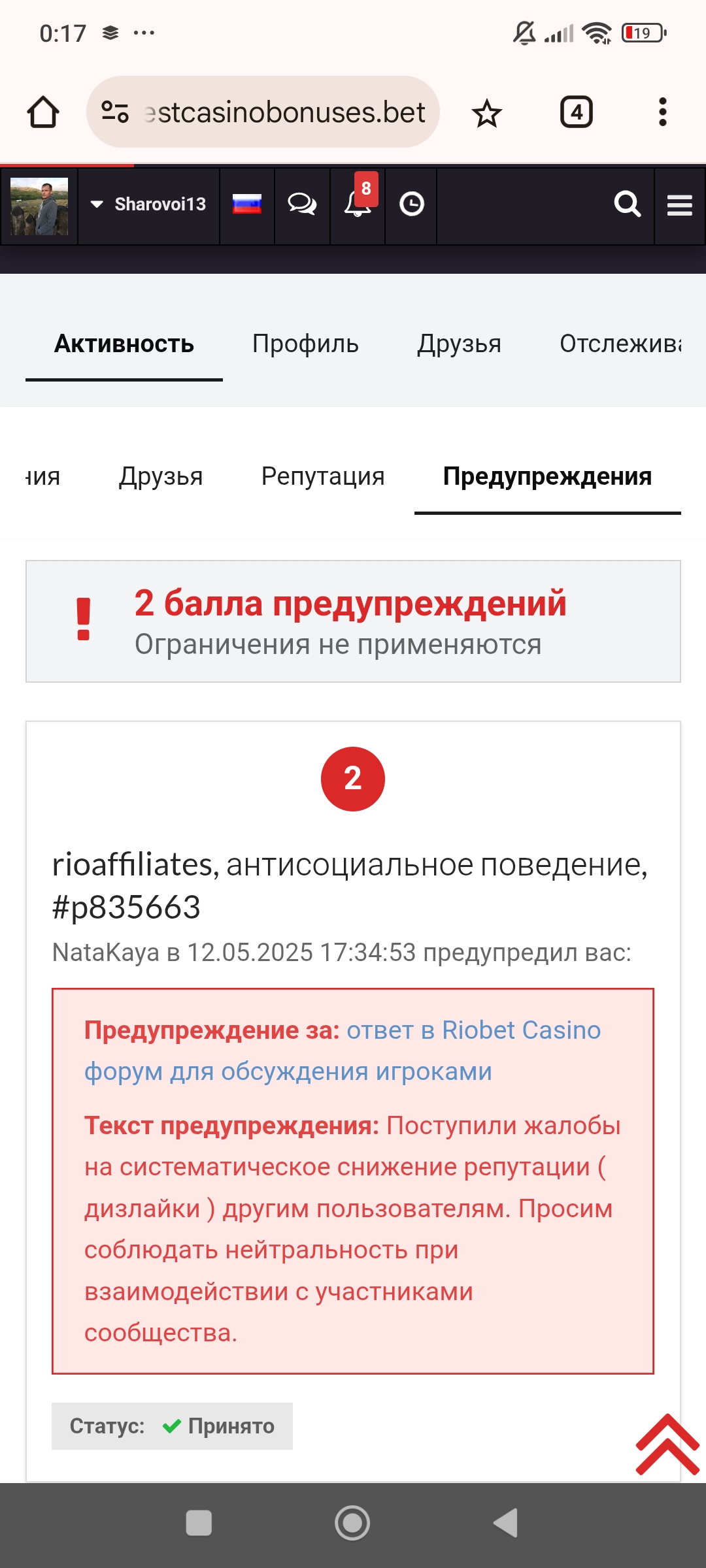 Дорогой игрок 😊 Лет 10 как прошли те времена, когда я могла огорчаться из-за предупреждений, снижения баллов и прочих реакций в различных сообществах. Не буду лишать вас удовольствия от данного инцидента. Он всё равно не даст никому преимущества при рассмотрении каких-либо ситуаций.